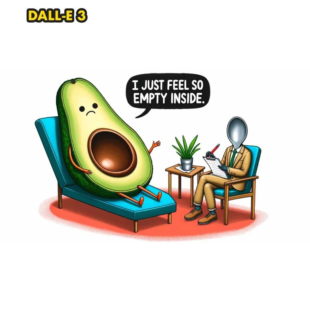 "一幅牛油果的插图,牛油果坐在治疗师的椅子上,说着'我觉得内心很空虚',中间有一个坑大小的洞。治疗师是一把勺子,正在潦草地记录着"。