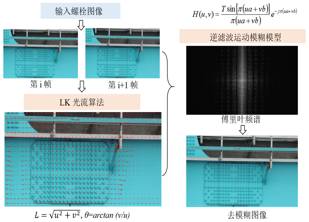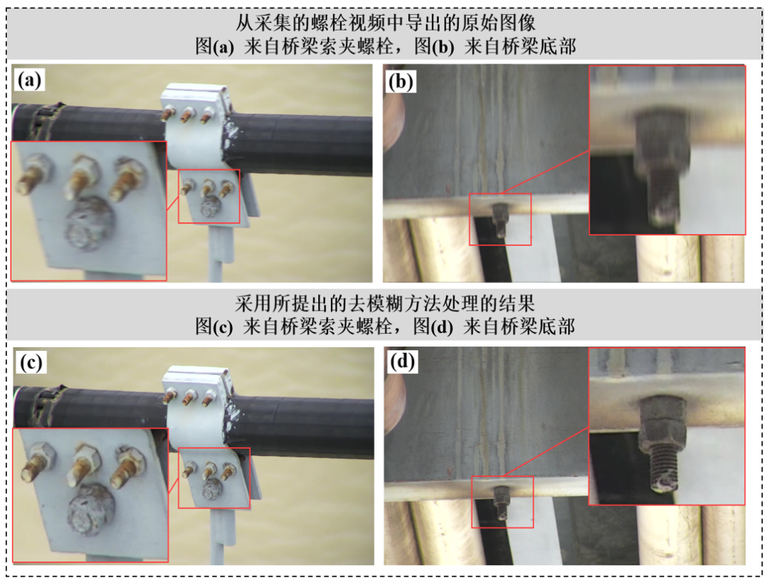 在采集完桥梁整体螺栓视频后,采取前述方法分步处理。首先采用基于光流和逆滤波的方法自动去除所拍摄视频中包含的运动模糊,由于所拍摄的视频的曝光时间一致,因此对于视频的去模糊处理无需人工调整参数,可自动处理,图7是采用所提出方法去除模糊的图像与原始图像的对比。