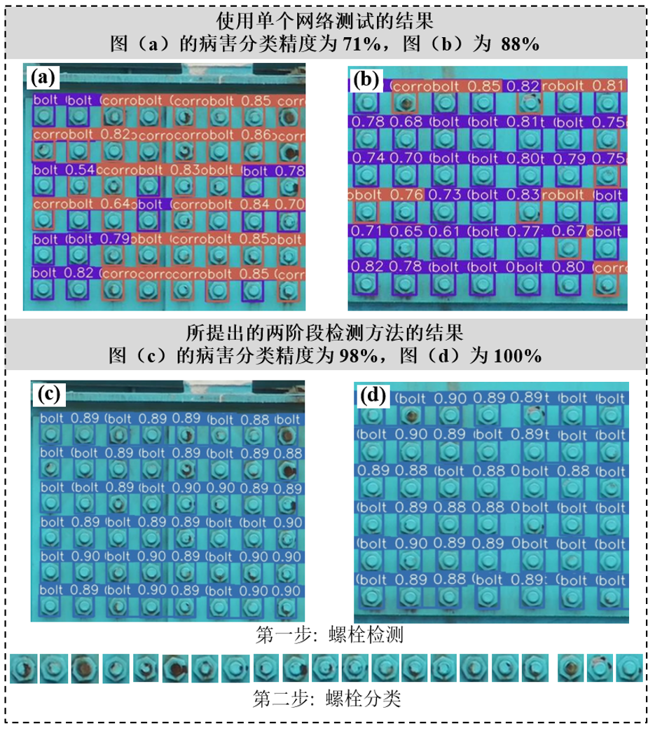 考虑到桥梁螺栓检测过程中螺栓数量庞大,人工难以复核自动检测的结果是否准确,因此保证螺栓的正确识别是最重要的目的。基于此提出采用目标检测模型和分类模型分步检测的方法,首先由YOLO v5x模型识别螺栓,记录螺栓位置,并根据识别结果将螺栓从图像中分割出来;分割出来的单个螺栓图像再经过efficientNet网络进行分类,判别正常螺栓、锈蚀螺栓和松动螺栓。本部分对比了仅使用单个目标检测网络和所提出的两阶段检测方法的检测精度,如下图所示: