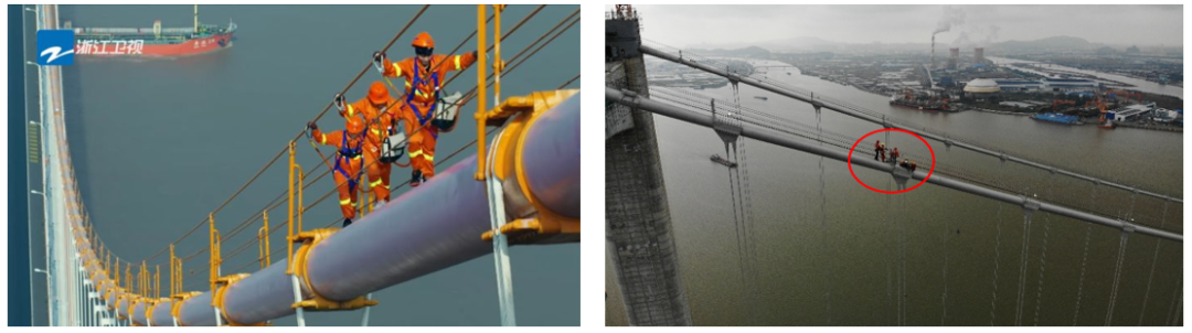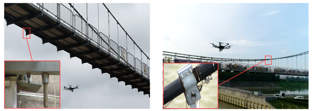 图6 悬索桥的无人机检测过程,(a)桥底螺栓检测,(b)索夹螺栓检测