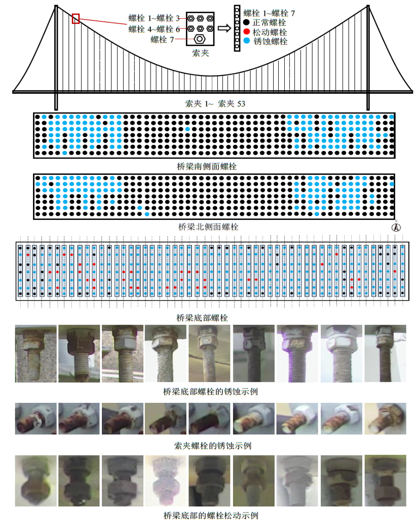 螺栓连接是钢结构桥梁中常用的一种连接方式。桥梁螺栓连接不仅需要承受结构自重、交通荷载、温度等引起的巨大负荷,还受到风荷载和车辆动载引起的桥梁持续振动的影响。因此,钢桥的螺栓损坏是其代表性的失效形式之一。螺栓劣化一般包括螺栓腐蚀、螺栓松动甚至是缺失。一旦螺栓松动或缺失,就意味着连接处的承载能力已经严重下降。因此,定期检测桥梁螺栓具有重要意义。现有的桥梁螺栓检测方法一般都是依靠人工目测检查,效率低下,对于大跨度桥梁的螺栓检测,特别是缆索的索夹部位的螺栓检测,依靠人工爬索目视检查的方法还存在极大的危险性。例如,一座大跨度的钢桁架桥通常包含数十万个螺栓,依靠人工目视的方法逐个检查需要耗费大量时间。为了检测一座大跨度悬索桥的索夹螺栓,工人需要爬到200多米高的主缆上,逐一观察索夹螺栓,这无疑极大地增加了作业的风险。