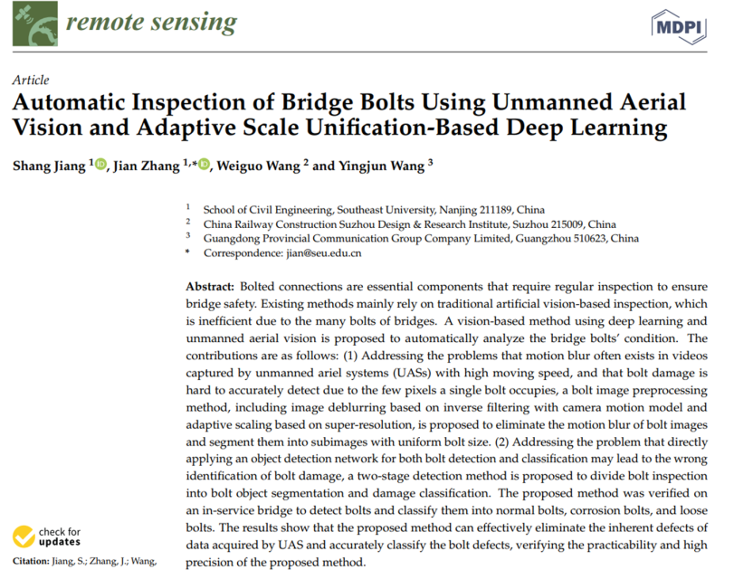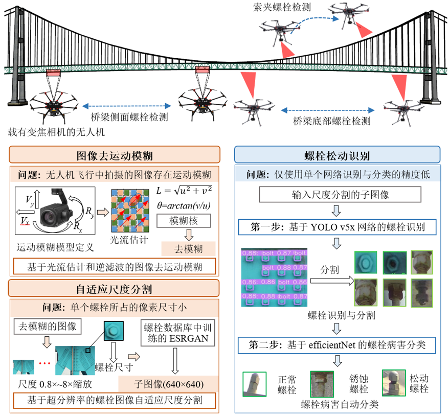 为解决上述问题,本研究提出了一种实用的桥梁螺栓快速自动化检测方法,该方法利用无人机收集螺栓图像,通过基于深度学习的自动分析方法识别螺栓并分类螺栓的病害,从而对在役桥梁的螺栓进行高精度和高效率的检测。与现有研究不同的是,所提出的方法的核心是减少飞行采集时造成的图像质量下降,并以尽可能高的精度识别螺栓的病害。具体来说,该方法首先搭建了一个为执行桥梁螺栓检测无人机系统,然后提出了使用无人机采集桥梁螺栓的具体拍摄方法方法。其次,提出了一种基于光流和逆滤波的图像运动模糊消除方法,以及一种基于超分辨率的自适应缩放方法,从而将无人机采集的原图像处理为清晰的具有统一尺度的子图像。最后,采用一种两阶段的螺栓检测方法来确定螺栓的劣化情况,即先应用在自定义数据集上训练的YOLO v5x网络检测螺栓并将其分割成单个螺栓图像,然后采用efficientNet将螺栓分类为正常螺栓、锈蚀螺栓和松动螺栓。