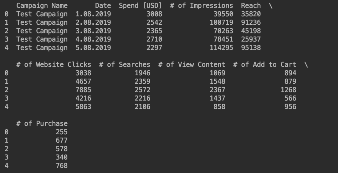 test_data.columns = ["Campaign Name", "Date", "Amount Spent",