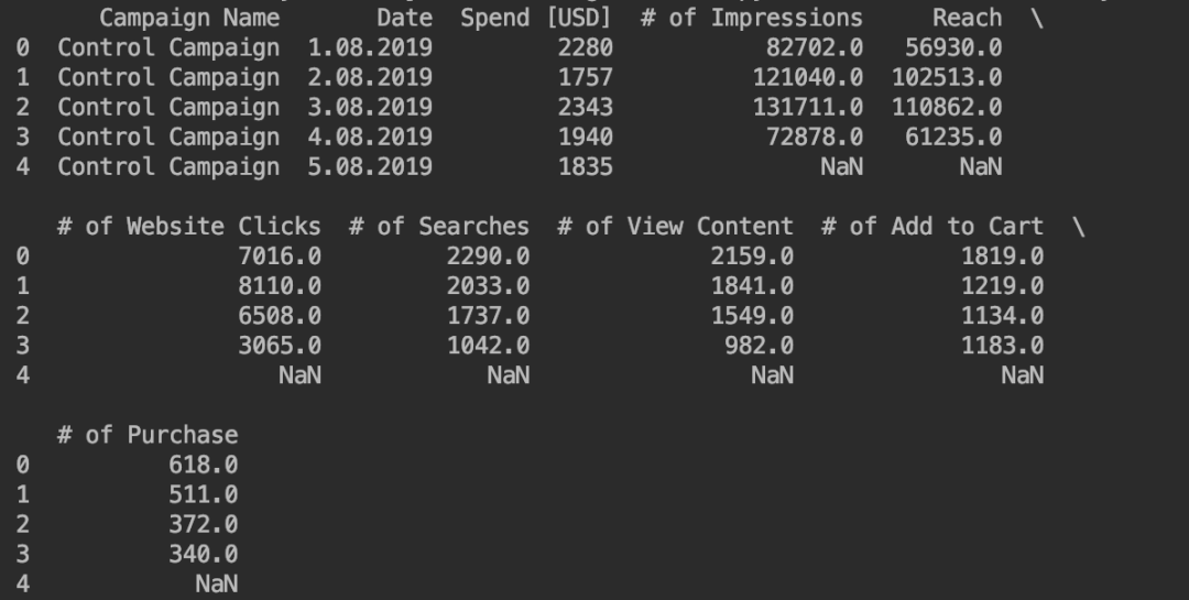 control_data.columns = ["Campaign Name", "Date", "Amount Spent",