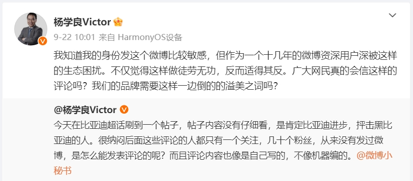 日前,吉利控股集团高级副总裁杨学良通过个人微博发文,内容引发关注。“今天在比亚迪超话刷到一个帖子,帖子内容没有仔细看,是肯定比亚迪进步,抨击黑比亚迪的人。很纳闷后面这些评论的人都只有一个关注,几十个粉丝,从来没有发过微博,是怎么能发表评论的呢?而且评论内容也像是自己写的,不像机器编的。”杨学良在微博中表示。