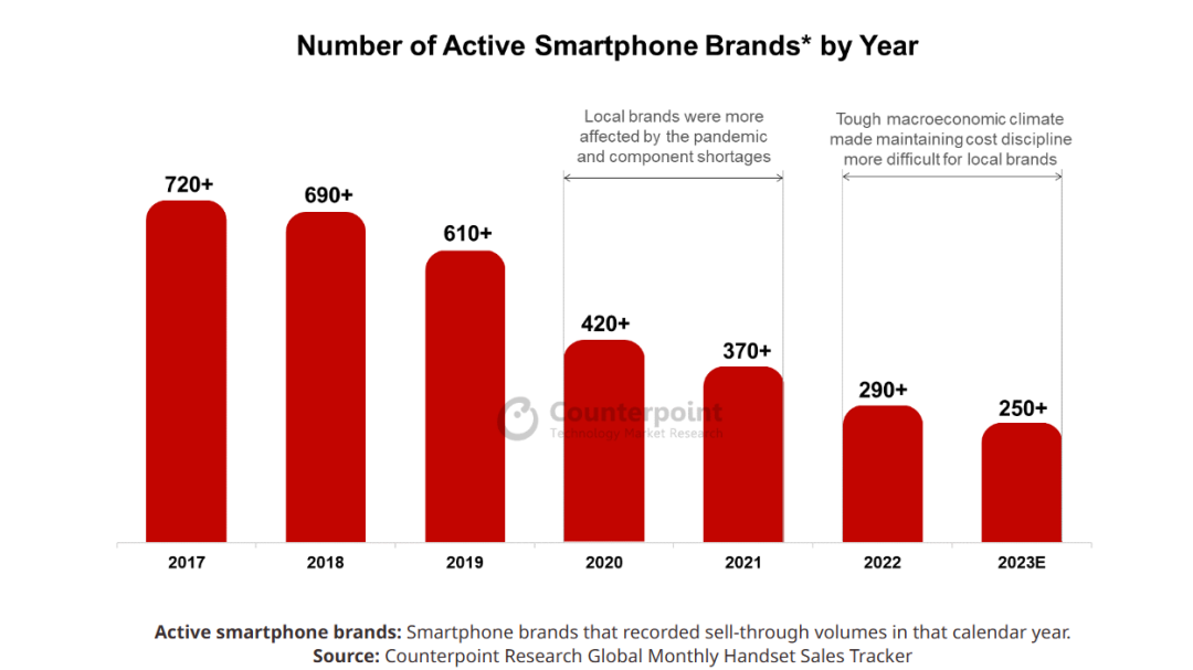 外媒报道,据 Counterpoint 研究报告表示,2017 - 2023 年,全球已有近 500 个手机品牌从市场上消失。在 2017 年,全球有 700 多个手机品牌,但到了 2023 年,只剩不到 250 个,总数减少了 2 / 3。报告认为,手机品牌总数不断降低的原因,主要在于市场逐渐饱和,以及从 4G 到 5G 等技术升级与消费者要求提升等。