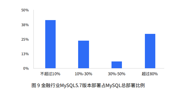 据调研,在使用MySQL开源数据库的金融企业中,MySQL5.7版本应用较广。所有部署MySQL的金融企业中,近六成企业选择MySQL5.7版本作为其运行版本,近三成企业使用MySQL5.7版本占其MySQL总部署量的80%以上。