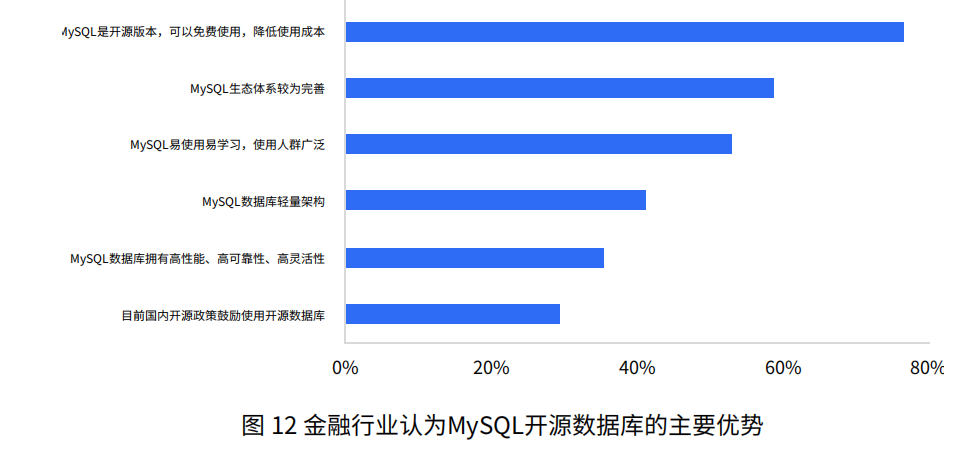 金融行业中,近80%企业认为MySQL开源版本能降低企业使用成本。超50%企业认为MySQL生态体系较完善,且易于学习与使用。近年国内开源政策的出台与完善,也增强了金融行业使用MySQL数据库的意愿。