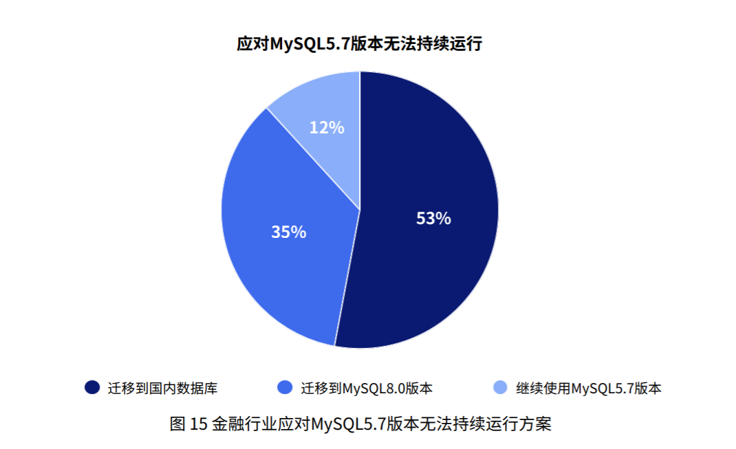 MySQL5.7版本生命周期结束,由于缺少后续的开源社区技术支持,已在金融行业产生影响,五成以上企业考虑迁移到有技术服务保障的国内数据库。金融行业中,71%的企业已知晓MySQL5.7版本生命周期结束事件,其中88%的企业已做出应对方案。所有应对方案中,超五成企业希望迁移到国内数据库,另有约三分之⼀企业将迁移到MySQL8.0版本。企业认为国内数据库应进一步提升产品性能,完善产品生态。