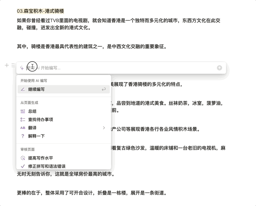 而我只用了1个小时完成的视频脚本,最后是一条接近千赞大爆款。你会说,自己写的东西一直是个0分作文,写的东西没有什么可读性,空洞没有画面感。那可放一万个心。利用notion Ai来润色文案,提升画面感,分分钟满分文案。在视频笔记中,我曾经要推荐一个香港街景的国产积木,写一段关于香港文化的文案。我只需要打开Notion Ai ,然后向他提出,请联系上下文,描写一段香港文化的200字文案,要有画面感和修辞。同样的,我需要一段唤起人思乡之情的文案,需要有画面感和故事感。