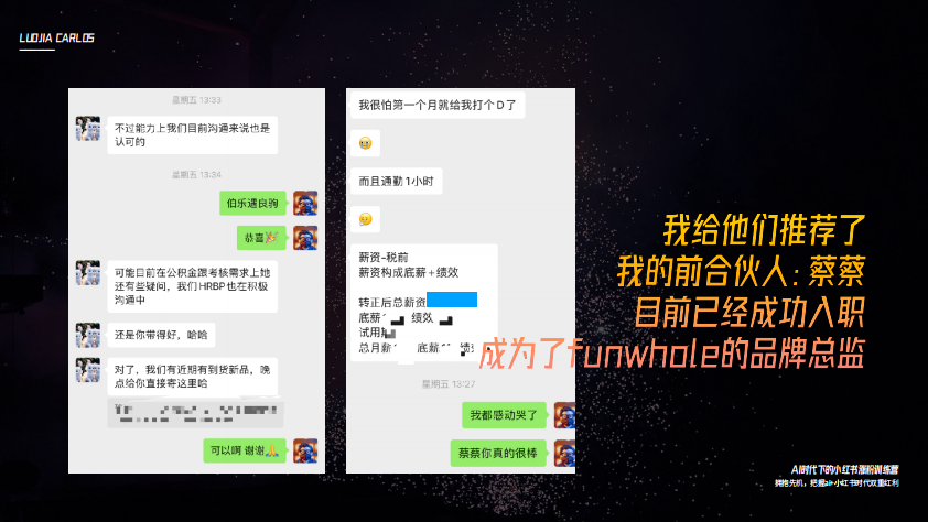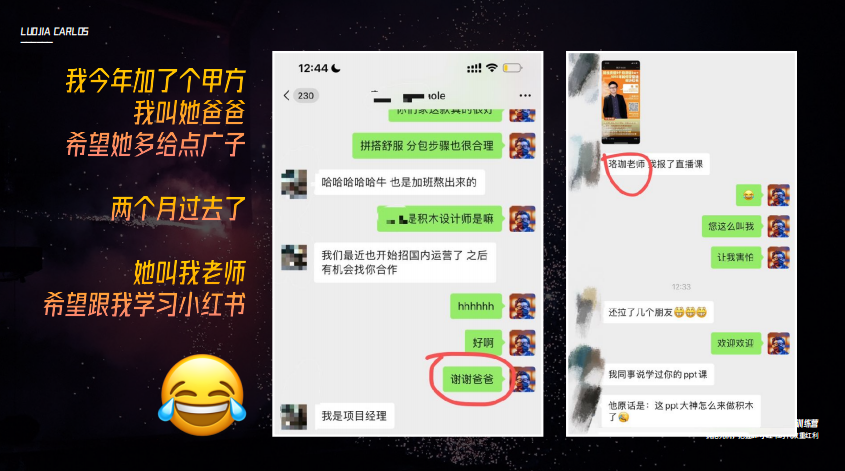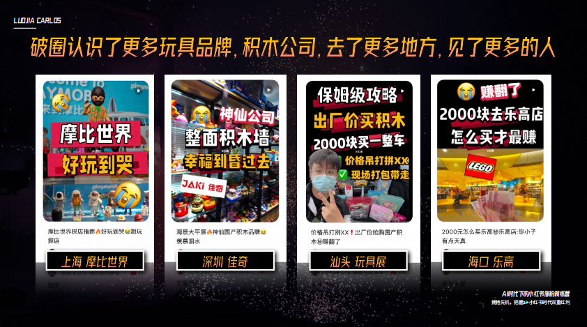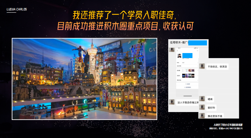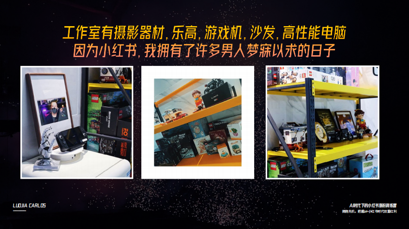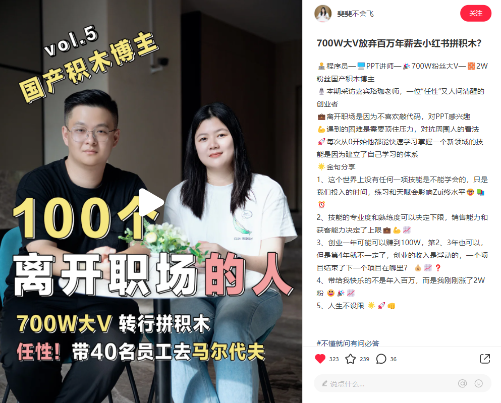 到了现在3W粉丝,我的档期已经排到9月份去了,提前一个月档期全满。不过以上都是小事,最关键的是——我从office赛道,进入到了实体潮玩赛道之后,我进入到了一种完全想象不到的新的奇妙人生。首先,作为一名中年男人,非常理解那种下班回家之后一个人在停车场里发呆不想回家的感受。那个时候,每个中年男人,都希望可以有一个自己的单独的空间——不用很大,但要有空调,有沙发,有高性能电脑,电视,游戏机,柜子里放着自己喜欢的手办,模型和数码产品,最好还有个冰箱可以放些零食。因为甲方每个月的广告费,我可以毫不费任何力气的,去租了一个100平米的办公室,作为我的拍摄工作室。多余钱我还采购了一些拍摄设备,我还采购了一些沙发,电脑,显示器,办公桌椅等等。然后工作室里面塞满了甲方给我免费寄来的各种玩具,模型,积木。因为每个月有甲方给的玩具,我的乐高,积木,模型啥的全都不用花钱,仓库目前屯了几百套,没事儿就摆着玩儿。然后有人来了就送一点。我周围的朋友,每个人都收到了我送的积木。工作室随便拍两张照片发在朋友圈,就是男生减速带。首先是,受邀请去了很多展会,破圈认识了非常多的玩具品牌,积木公司。汕头,深圳,广州,上海,北京,杭州,海口,全部都跑了一圈。这些品牌的负责人问我以前是干嘛的,我说我以前是做PPT教学的。他们很震惊。我以前的学员、同行、同事问我去干吗,我说我在拼积木,然后还搞了个工作室。他们也很震惊。我把很多身边因为PPT聚在一起的小伙伴推荐去了积木公司。比如我的前合伙人蔡蔡,就把她推去了一家专门做外贸的玩具品牌,她也很争气直接三轮面试手气刀落,年薪起步。比如我也把之前的一个学员佳佳推去了一家准上市积木公司,她最近操盘的积木社群项目也开始启动了。更有意思的是,我还把甲方转化成了学员。今年4月份我在小红书上加了积木圈的品牌项目负责人,刚开始微信聊天上,我叫她爸爸,希望她能多给点广子。几个月后,她带着一群小伙伴来我这儿听课,想跟我学小红书。她说,她同事知道我,还说,“怎么这个PPT大神来做积木了?”我也没有想过,小小的5万粉丝,能够给我的人生带来如此奇妙的化学反应。把这件事情发在朋友圈之后。甚至我还去了趟杭州和学员@斐斐建立了链接,把我这一年来的故事,做成了个采访视频。有兴趣可以看看,我觉得,拍的还不错。
