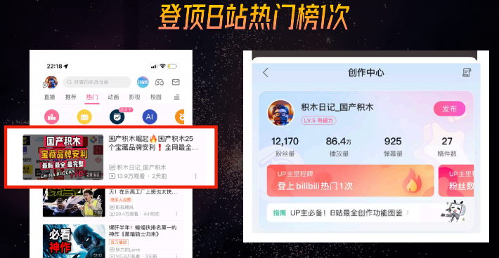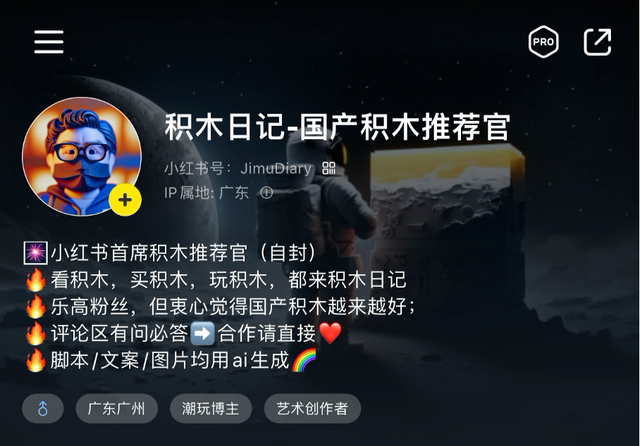 B站@小不明飞行物最关键的是,拍摄以上两种视频,我要耐心没耐心,我的摄影和剪辑技术更是毫无能力,毫无优势。我大概花了一个星期的时间去调研整个小红书平台的生态,我发现小红书平台的调性不太一样的地方。小红书平台作为一个消费决策类的平台。许多消费者会在下单之前,过来看看小红书的评价,然后转头再去电商平台下单。因此在小红书除了卷视频拍摄技法外,品牌和产品植入心智的内容也同等重要。而当时在积木领域,大家都知道乐高,对国产积木,几乎是闻所未闻,而且国产积木有哪些品牌,更是一无所知。因此,我决定做一个系列的口播视频——《国产积木品牌安利》,将视频生产的重点放在品牌资料收集,脚本文案撰写上,以真人口播的形式去拍摄视频。因为内容稀缺且赛道选择正确,我的《国产积木品牌推荐》视频,屡屡破1000赞,更是有着破万赞的大爆款。这3个月的发的视频里面,我一共斩获了16条1000+赞的大爆款。更是在今年5月份,顺手登上了B站热门榜首一次。排在我下面的是,影视飓风。迄今为止,我一共发布了120条视频,全都是我一个人撰写脚本,拍摄素材,剪辑,运营的。当然,要是以前,我很难一个人完成这件事情,但是现在有了Ai工具之后,我就能很快完成这件事情。我运用了Midjourney完成了我的账号人设搭建+小红书图文笔记生产