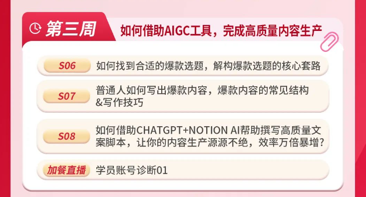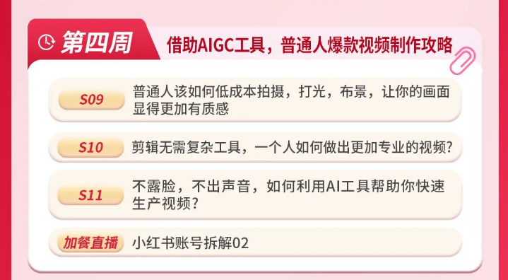 无论你用的是手机,电脑,还是ipad,在这套系统中,我们会为你提供。无论是用ai来写ppt大纲,制作表格,还是利用ai来写爆款的读书笔记,旅游攻略笔记。甚至来写一个500字以内的短视频脚本,甚至写一条3000字的场视频脚本,甚至是小说,都能用ai帮你完成。我们的很多学员,学会这个章节之后,以前要一个星期才能写出来的脚本,一天就能搞定,还纷纷做出了千赞爆款。第四周,我们会手把手教你制作一条能够涨粉的高质感视频很多人想做视频,但是不知道如何拍摄出高质感画面,设计灯光,剪辑。但是学完这个部份之后,小白也能很快拍摄出这样子的画面。而就算你只用1000-2000元手机,在一个两平米的小角落里,也能拍摄出这样还算不错的画面。同时,我们会教你利用最简单的剪映工具+手机,也能剪辑出点赞数千,甚至数万的视频。让同学们明白如何在笔记里面快速的获取曝光,抬高笔记的点击率。