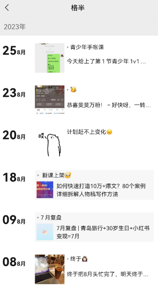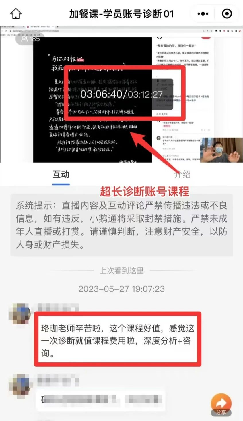 如何确定一个赛道是否当下的稀缺内容,在卷的赛道里面如何找到稀缺增长的细分内容。告诉你起号的三个规律底层方法,你只要掌握之后,只要认真发20条,95%的概率可以起号。在此之前,发100条只能涨300个粉丝,学会之后发3条就涨1000个粉丝。我不能让你不被限流,但我会教你如何规避限流,同时不耽误你赚到钱。如何建立一套安全的引流系统,不被平台规则限制,舒舒服服引流客户到手。不用学那么多的AI课,掌握精髓,一套公式生成你想要的所有图片,文字,视频。然后帮助学员手把手检测帐号问题,出规划意见,改进方案,找寻对标,给未来发展蓝图。懂得小伙伴就知道这个东西有多么值钱,很多小伙伴甚至就是因此来报名这个课程,纷纷呼喊超值。在诊断之前是一个手帐图文号,半年多的时间发了50条,只涨了300个粉丝。诊断期间,我给她提出了,直接转视频口播,出镜拍摄女性成长,母婴相关的建议。她在此之前做了很多尝试,报名过一些副业课,去做视频剪辑,视频号。重新做了个ai技能号,自己去分享一些ai使用方法,结果因为屡次踩到规则红线。和我深度沟通过一次之后,我发现十七真实职业,是一位教学能力很强的老师,我给了她一个方案。去做一个指导新手老师成长分享的教师IP号,切对了方向之后,十七做的非常得心应手。她想做个心理学博主,给自己取了名字,叫人生细品官兔叽,发了20来条内容,涨粉1个。我给了他个意见,把名字跟心理学强绑定,同时连续发心理学小知识笔记,做连续内容输出。