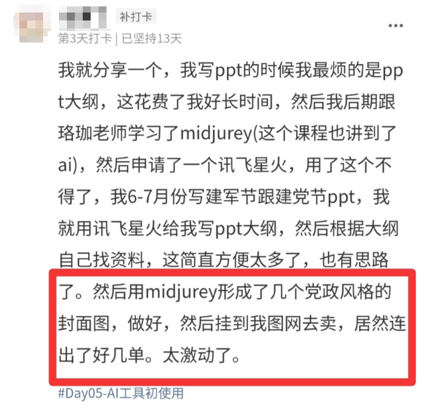 做头像、做背景图、做插画、做壁纸、做ai写真摄影、做各种各样的素材图片。还是利用chatgpt帮助你写个人介绍。制作ppt文档,或者视频脚本,都会非常详尽的交给你。很多学员在我们这儿,学完了ai工具之后,都用ai在小红书上实现百赞,前赞的爆款,甚至班期内,就有学员利用ai工具完成了变现。可以说,这门课程ai这个板块单独令出来,都是一个数千元级别训练营而经过这个章节的学习,和老师指导之后,重新对自己的定位和帐号人设进行了调整。