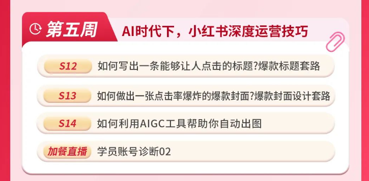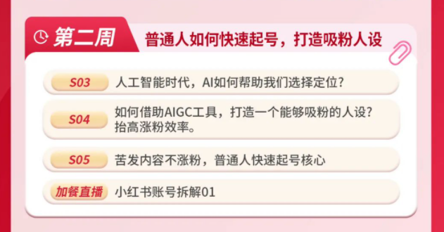 这年头做小红书,做自媒体,早就不是一个努力勤奋就能解决的问题。说白了,你要懂平台,懂定位,懂规则,懂运营,懂流量。首先,我们会引导大家选择适合自己的赛道,完成自己的帐号定位让你无论在2023年,2033,还是2133年,都可以自主预测和判断平台红利。让新媒体红利这个事情,不再是一件看得见,摸不着,也抓不住的沙子。同时我们也会告诉你,如何科学合理的判断一个稀缺的内容赛道。如果你还是不知道什么帐号定位适合你,我们也会给你普通人能够入手,能够变现的定位方向。第二周,我们会帮你利用ai工具打造一个属于你的高粘度,高价值的帐号人设利用Ai工具出图,取名字,写介绍,抬高涨粉效率,突破苦发内容却难涨粉的问题。需要说明的是,这门课程特色之一,是包含了全程的ai工具教学内容,非常完整。无论是用midjourney出图,