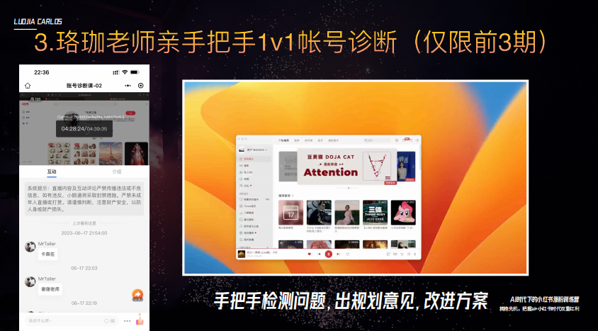 她听话照做,现在一个月不到,已经快2000粉丝了。甚至还有些几万,甚至几十万粉的小红书成型博主来报名这个课,来找我做帐号诊断然后我给她设计了,从月入5w,到月入20w的完整的规划方案和蓝图。而为了提供这30分钟,我每个学员的帐号都会提前看上那么2-3个小时,花上数个小时时间准备。这就是为什么这门课程名额有限,每一期只能招100人。开放所有诊断案例文档和诊断回听视频从第一期开始,到第三期,我已经积累了超过50+不同帐号的诊断文档,和诊断视频覆盖潮玩,母婴,占星,留学,职场,线下,珠宝等多个赛道。如果你对课程感兴趣,或是还有疑问的,都可以扫描海报二维码咨询课程顾问,或是来直播间直接问我。