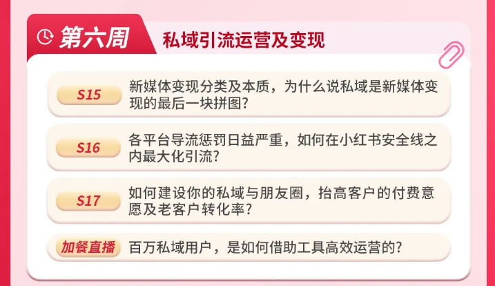 同时我们就用最简单的PPT工具,也能做出点击率爆高的封面图。很多人都知道,小红书的引流非常困难,动不动就会被限流。如何把小红书的用户引导到私域中是一个老大难的问题。特别是对于想做线下服务,卖货,咨询产品:譬如留学,婚恋,占星,塔罗,k12的学员。但是我们会告诉你,如何建立一个引流系统,在小红书里面安全不碰规则红线的进行引流。当你引流到私域之后,该如何利用朋友圈和私域运营,去链接客户。如何让客户成为你的终生付费用户,有哪些方法,有哪些诀窍。这门课程拥有7类独家的特色内容,满足你方方面面的需求掌握一套判断新媒体平台红利的数据算法,你可以自主判断预测未来的红利。
