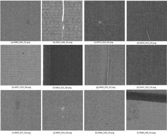 该数据库由七个不同织物结构的245张4096 x 256像素图像组成。数据库中有140个无缺陷图像,每种类型的织物20个,除此之外,有105幅纺织行业中常见的不同类型的织物缺陷(12种缺陷)图像。图像的大尺寸允许用户使用不同的窗口尺寸,从而增加了样本数量。