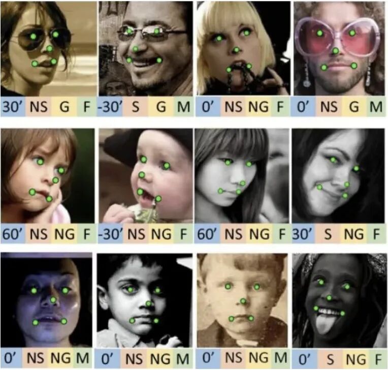 该数据集包含通过在谷歌图片搜索中输入常见的名字从网络上收集的人的图像。每个正面的眼睛、鼻子和嘴巴中心的坐标在地面实况文件中提供。此信息可用于对齐和裁剪人脸或作为人脸检测算法的基本事实。该数据集有 10,524 个不同分辨率和不同设置的人脸,例如 肖像图像、人群等。侧面或非常低分辨率的面孔未标记。