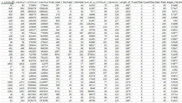该数据集包含了7种带钢缺陷类型。这个数据集不是图像数据,而是带钢缺陷的28种特征数据,可用于机器学习项目。钢板故障的7种类型:装饰、Z_划痕、K_划痕、污渍、肮脏、颠簸、其他故障。