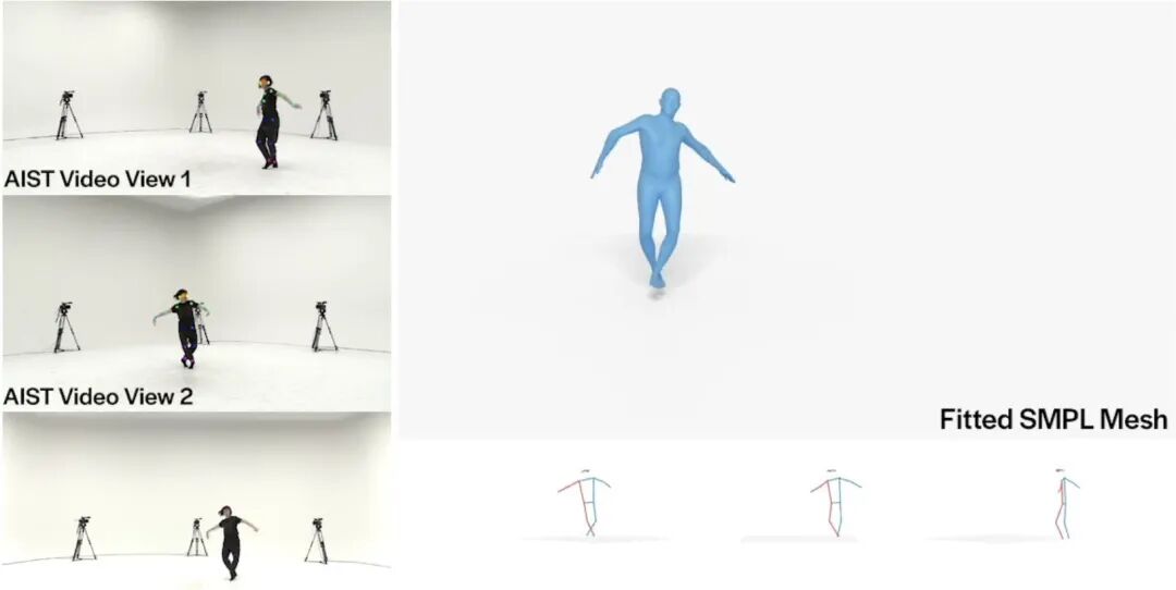 AIST++ 舞蹈动作数据集是从 AIST 舞蹈视频数据库构建的。对于多视图视频,设计了一个精心设计的管道来估计相机参数、3D 人体关键点和 3D 人体舞蹈动作序列: