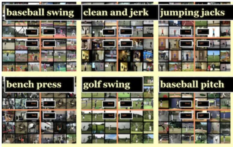 由布朗大学发布的人类动作视频数据集,该数据集视频多数来源于电影,还有一部分来自公共数据库以及YouTube等网络视频库。数据库包含有6849段样本,分为51类,每类至少包含有101段样本。