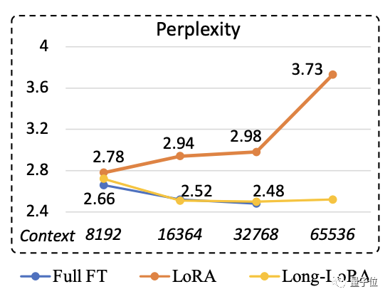 结果显示,LongLoRA在PG19和Proof-pile上的困惑度与全量微调接近。