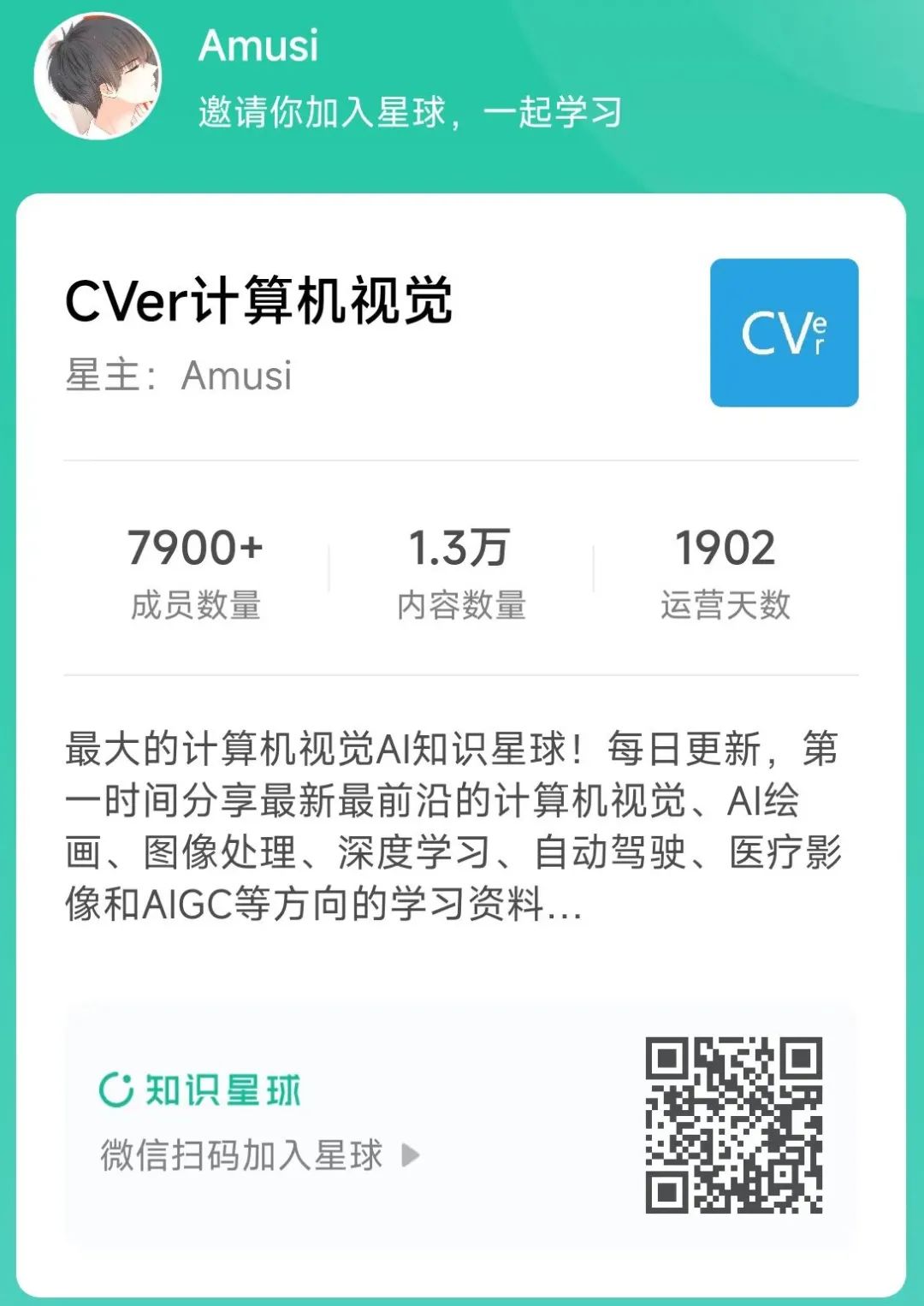 CVer计算机视觉(知识星球)来了!想要了解最新最快最好的CV/DL/AI论文速递、优质实战项目、AI行业前沿、从入门到精通学习教程等资料,欢迎扫描下方二维码,加入CVer计算机视觉,已汇集数千人!