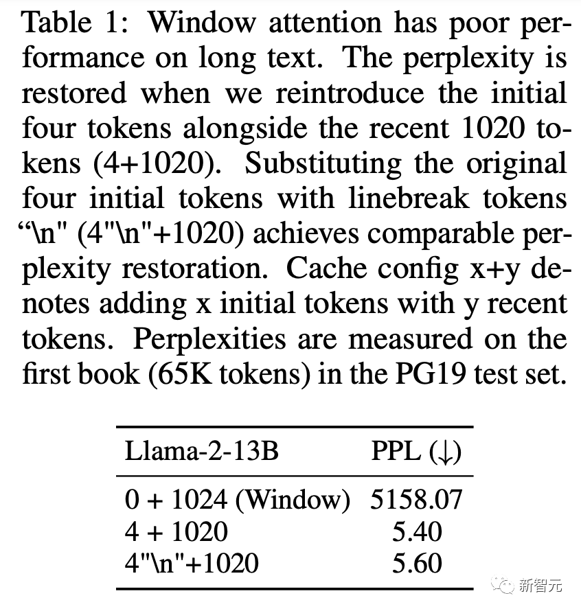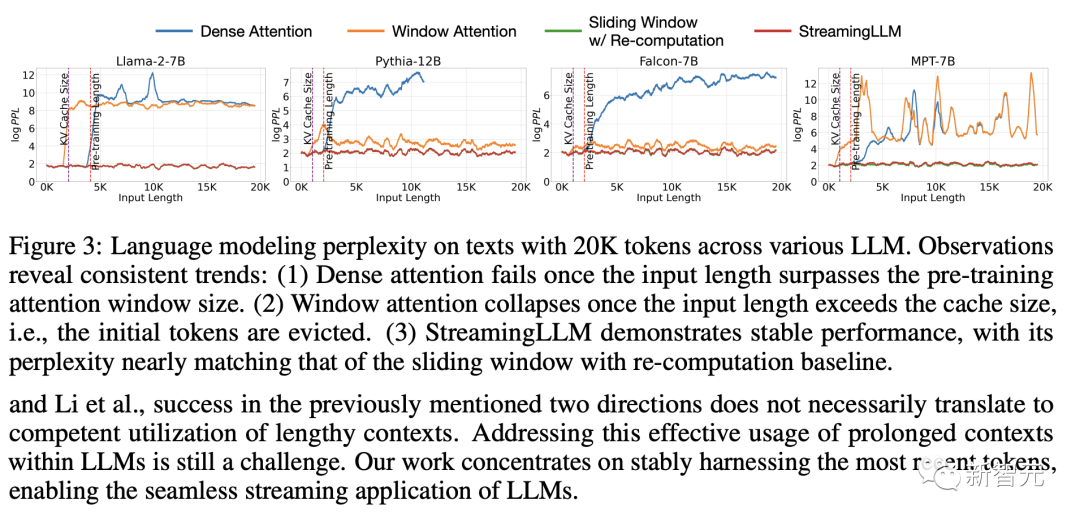 上图显示了 20K token文本的语言建模的复杂性。很明显,当文本长度超过缓存大小时,由于排除初始token而导致困惑度度激增。这表明初始token,无论与预测token的距离如何,对于维持 LLM 的稳定性至关重要。