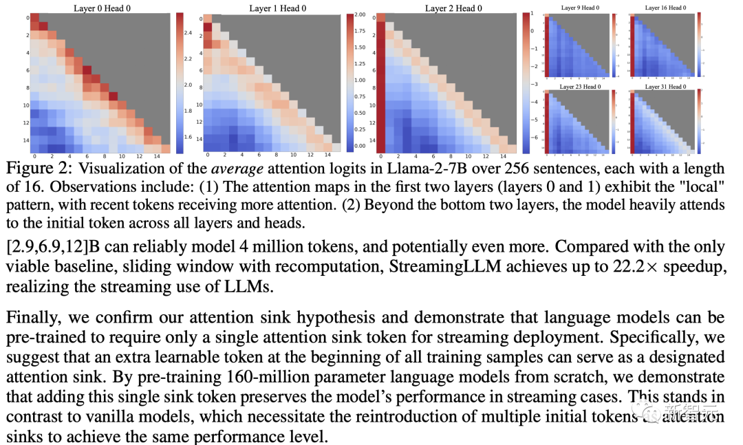 研究人员将 Llama-2-7B 和模型的所有层和头部的注意力图可视化,如图 2 所示。研究人员发现,除了底部两层之外,模型始终关注所有层和头部的初始token。