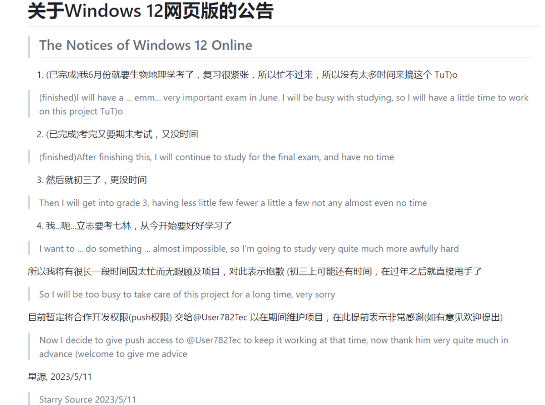 作者还表示,因为自己已经上初三了,未来会有很长一段时间因太忙而无暇顾及项目,所以暂时把项目交给了贡献者进行维护。前两天开源中国报道了“初中生编写 Windows 12 网页版”后,引起了不少“资深”开发者的质疑,有人认为这是父母写开发的,有人觉得初中生哪有空折腾这些。