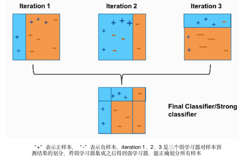 - 更加合理的边界:弱分类器间存在一定差异性,导致分类的边界不同。多个弱分类器合并后,就可以得到更加合理的边界,减少整体的错误率,实现更好的效果;