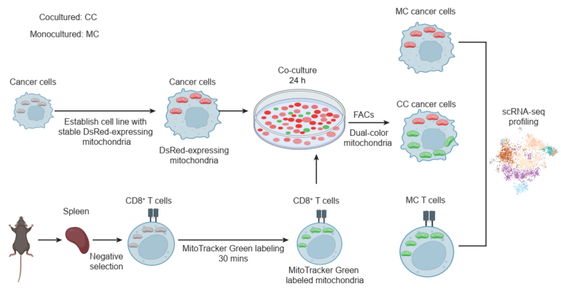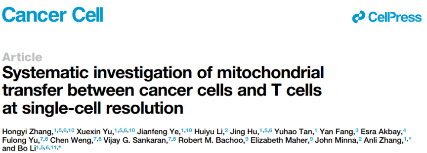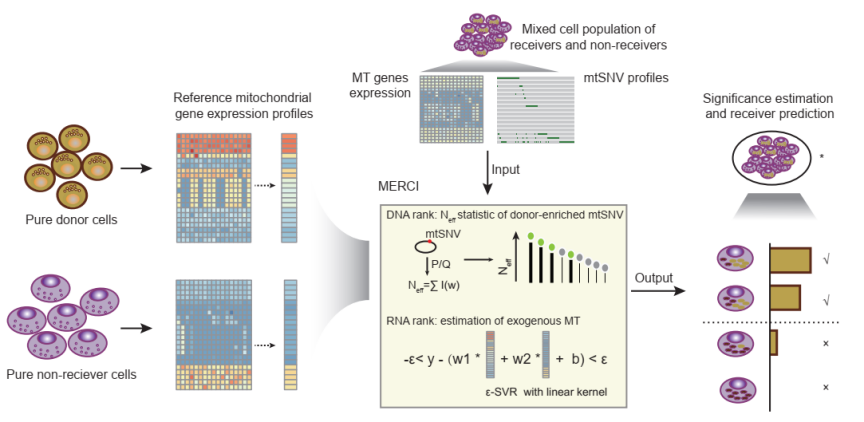 线粒体参与了真核细胞几乎所有的代谢活动 (例如能量生成,信号传导以及细胞程序性死亡等),是哺乳动物在亚细胞层面最重要的“发动机”。线粒体可以通过细微的纳米管道在不同谱系的细胞间流动从而达到组织修复的目的, 这一生物学现象最早在2006年被观测确认【1】。2022年,哈佛大学医学院Saha博士等首次发现了线粒体从T淋巴细胞到癌症细胞的单向转移【2】。这一新的生物学过程不仅从代谢上增强了癌细胞的生存能力同时削弱了免疫细胞的活性。健康的线粒体为T细胞提供了必需的能量以及代谢物,对T细胞在肿瘤微环境中的激活状态维持至关重要,因此该发现为肿瘤的免疫逃逸以及T细胞的功能失调研究提供了全新的见解, 有很大希望成为新的癌症免疫治疗方向。进一步的研究则需要在实验动物体内乃至真实癌症患者的肿瘤组织中进行,然而已有的生物学技术无法做到在体内追踪线粒体的运动轨迹。目前一个颉待解决的难点在于:没有现实可行的方法能在真实人类肿瘤中对癌细胞与T细胞间的线粒体传输进行研究并发现可药物靶向的关键基因和通路。2023年10月9日,宾夕法尼亚大学医学院/费城儿童医院李博教授团队在Cancer Cell杂志上在线发表了题为“Systematic investigation of mitochondrial transfer between cancer cells and T cells at single-cell resolution” 的研究论文。该研究不仅坐实了T细胞与癌细胞间线粒体传输在不同癌症中的广泛存在, 更重要的是,提出了基于贝叶斯层次模型与统计反褶积的机器学习方法MERCI, 实现了在单细胞分辨率下追踪不同细胞间线粒体传输的重要功能。研究团队首先通过荧光标记线粒体的KrasG12D/p53ko(KP)癌细胞与CD8+ T细胞共培养系统,在不同癌症中重现并证实了Saha等人的观测结果【2】,即随着共培养时间延长,T细胞中的线粒体逐渐流失并转移到癌症细胞中。之后研究团队在不同培养条件和不同癌症细胞系中反复确认了此生物学过程的可重复性,并着手产生了用于算法开发的金标准数据集(图一)。该数据集一共包括三套单细胞RNA-seq样本: 共培养的receiver癌症细胞 (case 组), 单独培养的non-receiver 癌症细胞以及donor T细胞 (control组)。在产生的单细胞数据集中,研究团队发现癌症细胞在接收到外源性的T细胞线粒体后,其本身的mtDNA变异图谱以及线粒体基因转录模式会发生显著改变,主要变化为:1)T细胞特异或者富集的mtDNA突变会更多出现在receiver癌细胞中;2)receiver癌细胞的线粒体基因的转录表达模式与T细胞相似。这两点重要发现表明了在scRNA-seq数据中捕获细胞间的线粒体传输信号完全可行,为MERCI算法(图二)的开发提供了重要的事实基础和理论支持。MERCI利用秩转化的策略整合了单细胞水平的mtDNA突变谱以及线粒体基因的转录表达谱,从而准确预测劫持了T细胞线粒体的receiver 癌细胞并估计每个单细胞中外来线粒体的相对丰度。为了无偏性的评测MERCI算法,研究团队额外产生了独立的scRNA-seq以及mtscATAC-seq数据集并证实了MERCI算法准确性,ROC曲线AUC值根据不同的条件和参数在 0.7~0.9之间浮动,远高于随机期望。研究团队将MERCI应用于真实人类癌症患者的单细胞数据中,在不同癌症类型的多个样本中确认了肿瘤细胞劫持T细胞线粒体的生物学现象,并揭示了TNFα通路与该过程中细胞间的纳米管行成高度相关。通过MERCI算法,研究团队首次实现了线粒体转移在真实肿瘤样本中的体内追踪研究。值得指出的是,尽管在本研究中,研究团队只将MERCI用于线粒体转移在T细胞和癌细胞之间的追踪,原则上MERCI可应用于任意两种不同的细胞类型。当单细胞测序数据质量合格时(单细胞测序读长(read)的线粒体覆盖度 > 1000),MERCI的预测准确度具有较强的鲁棒性。因此MERCI有希望作为一个通用方法以解析复杂细胞网络中线粒体的流动问题并帮助推动癌症免疫治疗的发展。这项研究的通讯作者是宾夕法尼亚大学的李博教授和德克萨斯大学西南医学中心的张安利博士。宾夕法尼亚大学的张洪溢博士、于雪新博士以及西南医学中心的叶建锋博士是本研究的共同第一作者。
