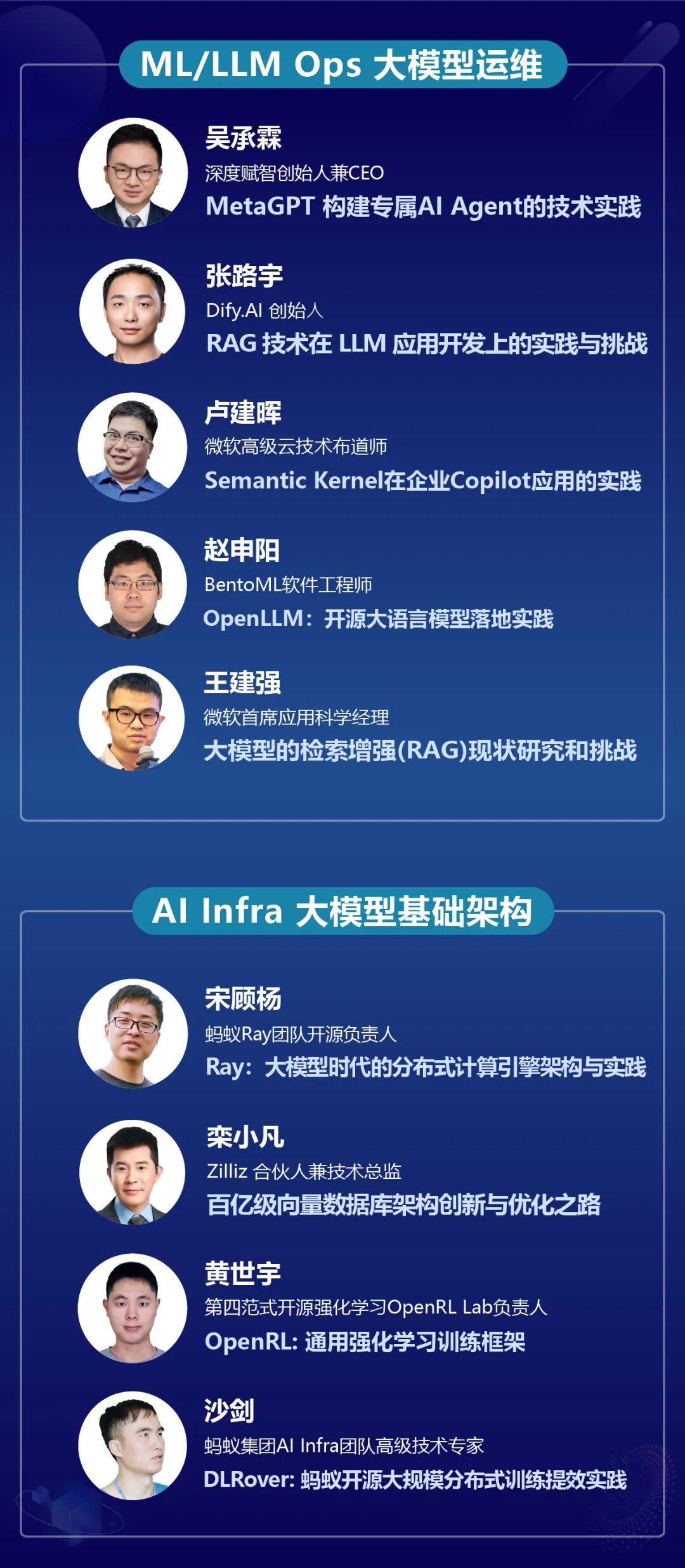 大模型技术落地,ML/LLM Ops和AI Infra的支撑作用必不可少。来自MetaGPT、Dify、微软、OpenLLM等专家 将分享AI Agent、RAG搜索增强、Semantic Kernel 应用框架等最新发展;来自蚂蚁集团、Zilliz、第四范式、DLRover将分享分布式计算、训练、向量数据库、强化学习训练框架等精彩主题。