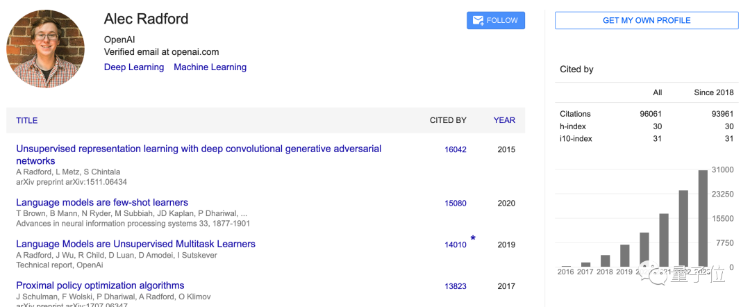 最后,关于ChatGPT本身,奥特曼还cue到了两个小小的“花絮”。其一,ChatGPT之所以叫ChatGPT,没有像人名的昵称,就是因为奥特曼不想往“AI女友”产品的方向上走。其二,ChatGPT并非OpenAI最初就“倾力投入”的一个项目。由始至终,OpenAI甚至只有一个本科生坚持做大模型方向的研究,其他人或多或少都转向过机器人、或是游戏AI等其他领域“发发论文”。这个只搞大模型的本科生,就是Alec Radford,如今在谷歌学术上的论文引用次数已经达到9.6w+。2016年,Alec Radford于富兰克林·欧林工程学院(Franklin W. Olin College of Engineering)取得学士学位,随后加入OpenAI,一干就是7年。正是他所坚持的大语言模型路线,改变了OpenAI公司、乃至整个AI领域的发展方向。OpenAI一开始并未确定大模型这一研究方向,但我们仍然招了AI研究员,并在取得突破后让更多人加入其中,最终成就了ChatGPT。