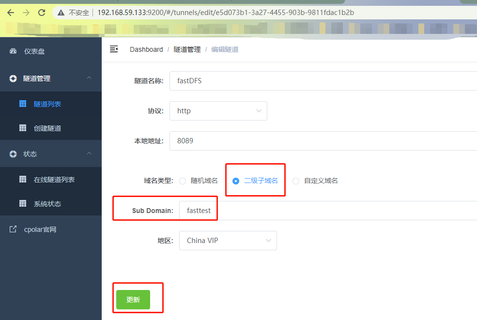 修改隧道信息,将二级子域名配置到隧道中: