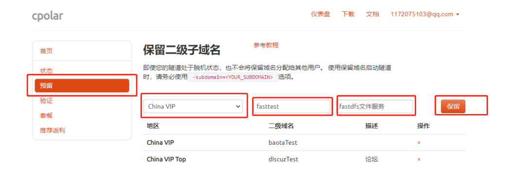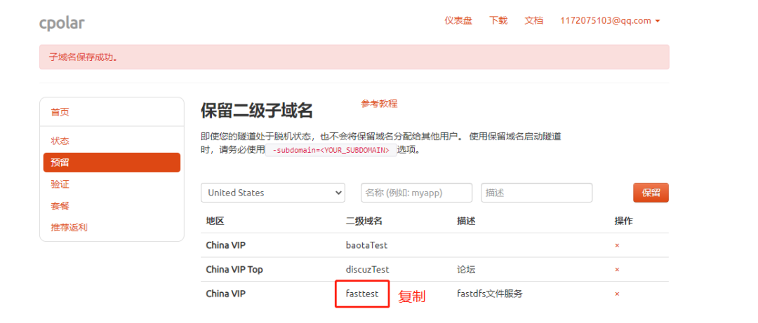 本例保留一个名称为fasttest的二级子域名。子域名保留成功后,我们将子域名复制下来,接下来需要将其配置到隧道中去。