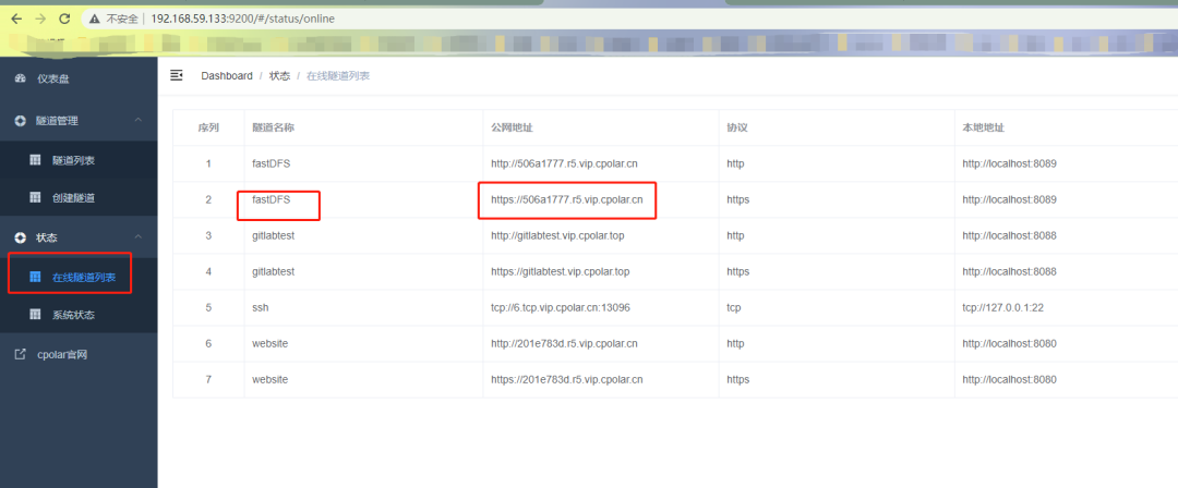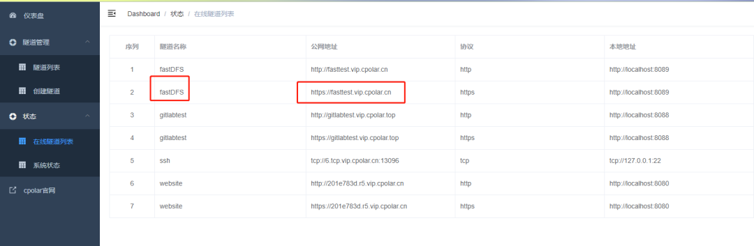 隧道更新成功后,点击左侧仪表盘的状态——在线隧道列表,可以看到隧道的公网地址,已经更新为二级子域名了,将公网地址复制下来。