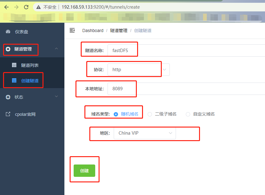登录成功后,点击左侧仪表盘的隧道管理——创建隧道,创建一个http协议的隧道指向上面设置的Nginx8089端口:
