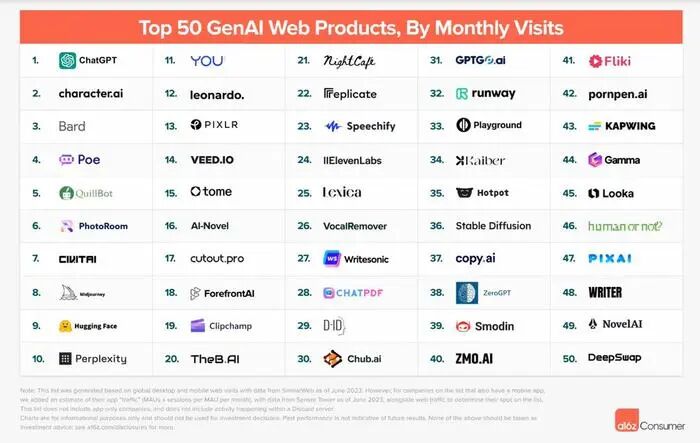 2.【AI网站全球流量前50榜出炉:ChatGPT排第一】美国知名风投公司 a16z 日前对目前市场上流量最高的 50 款面向 C 端用户开放的 AI 产品进行了排名。ChatGPT 在榜单中排行第一,该产品占据了这份 Top50 榜单总流量的 60%。