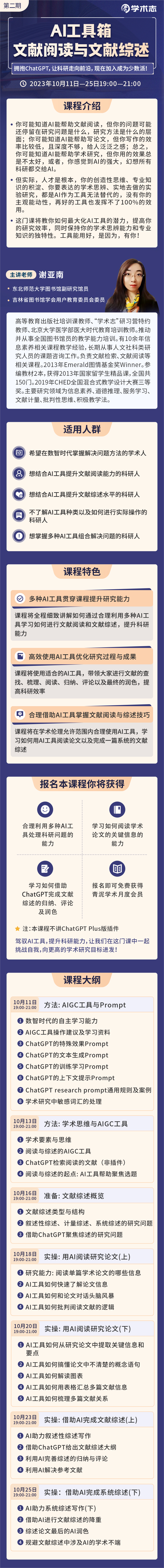 在人工智能时代,如何合理借助AI工具的力量辅助科研,做好文献阅读和文献综述?学术志特地推出《第二期文献阅读与文献综述:AI工具箱》直播课程,主讲老师是谢亚南老师,谢老师有10余年信息素养相关课程教学经验,长期从事人文社科类研究人员的课题咨询工作。并且在学术志平台开设过文献检索、文献阅读等相关课程,第一期的课程也收获了众多学员的好评。在本次课程中,谢老师将通过讲解多个AI工具,通过实际操作,带领大家高效寻找阅读文献,合理借助AI工具完成文献综述,并借助ChatGPT完善综述的归纳、评论及润色。