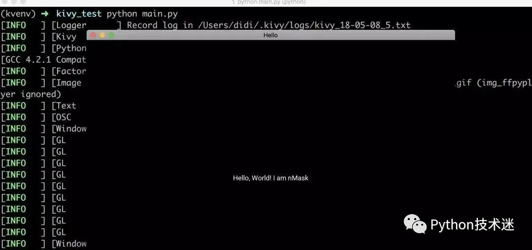 $pythonPython 2.7.10 (default, Jul 15 2017, 17:16:57)[GCC 4.2.1 Compatible Apple LLVM 9.0.0 (clang-900.0.31)] on darwinType "help", "copyright", "credits" or "license" for more information.>>>>>> import kivy[INFO ] [Logger ] Record log in /Users/didi/.kivy/logs/kivy_18-05-08_4.txt[INFO ] [Kivy ] v1.10.1.dev0, git-5f6c66e, 20180507[INFO ] [Python ] v2.7.10