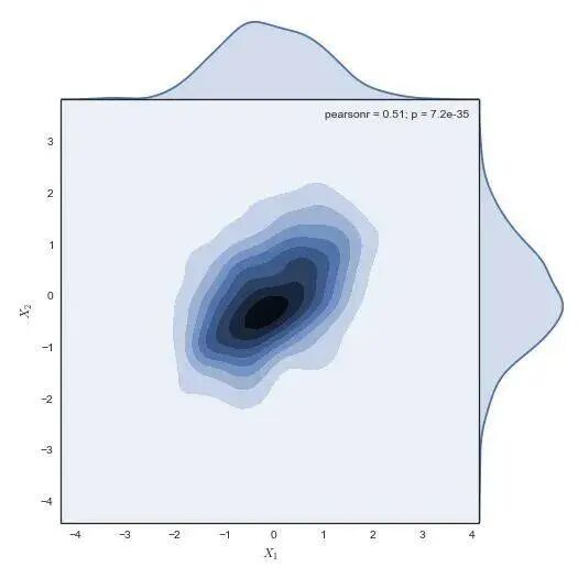 g = sns.jointplot(x1, x2, kind="kde", size=7, space=0)