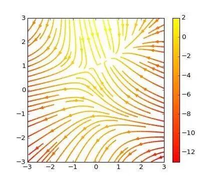 plt.streamplot(X, Y, U, V, color=U, linewidth=2, cmap=plt.cm.autumn)plt.colorbar()