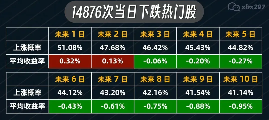 这些当日上涨的热门股在未来1-10天的上涨概率显著低于50%,且平均收益也均为负。