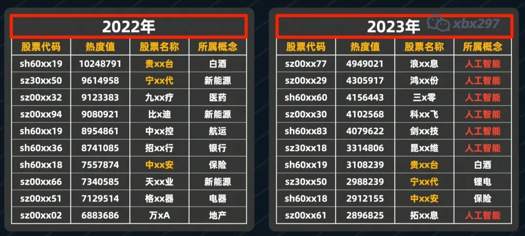 2022年的热点较散乱,2023年最热门的股票则大多集中在AI概念,只有三只股票连续两年稳坐热搜前十。