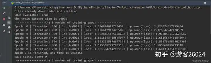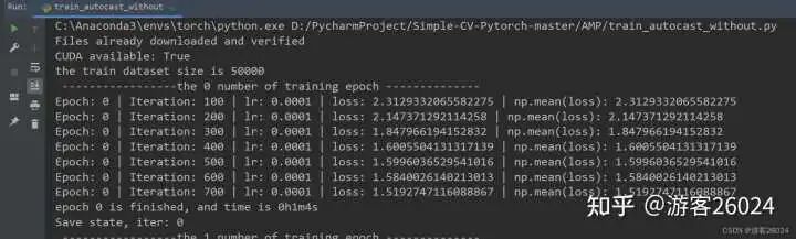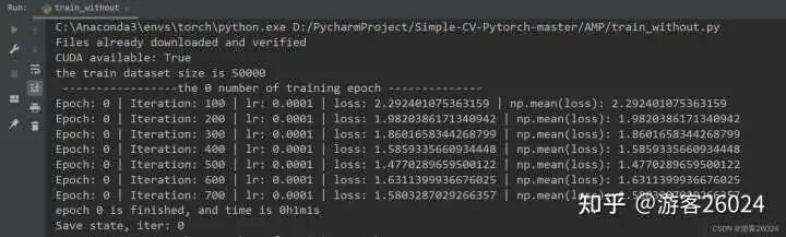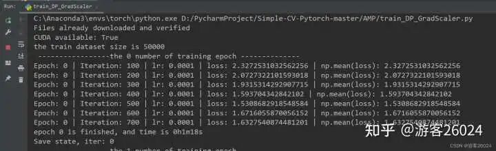 # 8. Set some parameters to control loop # epoch iter = 0 t0 = time.time() for epoch in range(args.epochs): t1 = time.time() print(" -----------------the {} number of training epoch --------------".format(epoch)) model.train() for data in train_dataloader: loss = 0 imgs, targets = data if args.cuda == cuda: cross_entropy_loss = cross_entropy_loss.cuda() imgs, targets = imgs.cuda(), targets.cuda() with autocast(): outputs = model(imgs) loss_train = cross_entropy_loss(outputs, targets) loss = loss_train.item() + loss if args.tensorboard: writer.add_scalar("train_loss", loss_train.item(), iter)