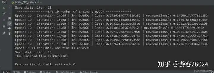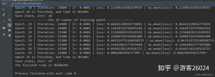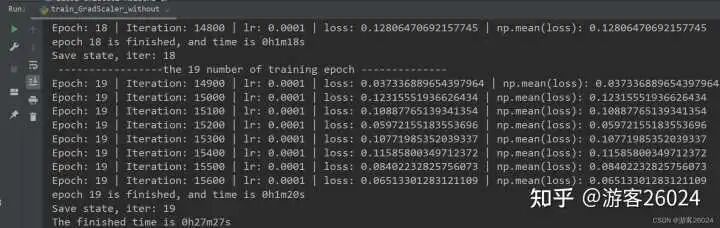 scaler.scale(loss_train).backward() scaler.step(optim) scaler.update() iter = iter + 1 if iter % 100 == 0: print( "Epoch: {} | Iteration: {} | lr: {} | loss: {} | np.mean(loss): {} " .format(epoch, iter, optim.param_groups[0]['lr'], loss_train.item(), np.mean(loss))) if args.tensorboard: writer.add_scalar("lr", optim.param_groups[0]['lr'], epoch) scheduler.step(np.mean(loss)) t2 = time.time() h = (t2 - t1) // 3600 m = ((t2 - t1) % 3600) // 60 s = ((t2 - t1) % 3600) % 60 print("epoch {} is finished, and time is {}h{}m{}s".format(epoch, int(h), int(m), int(s)))