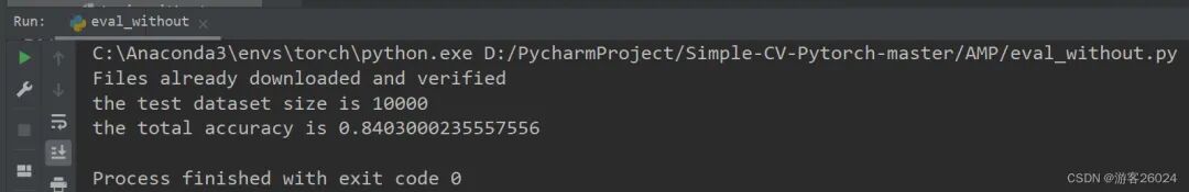 # test model.eval() with torch.no_grad(): for data in test_dataloader: imgs, targets = data device = torch.device('cpu') imgs, targets = imgs.to(device), targets.to(device) model_load = torch.load("{}/AlexNet.pth".format(args.checkpoint), map_location=device) model.load_state_dict(model_load) outputs = model(imgs) outputs = outputs.to(device) accuracy = (outputs.argmax(1) == targets).sum() total_accuracy = total_accuracy + accuracy accuracy = total_accuracy / test_dataset_size print("the total accuracy is {}".format(accuracy))